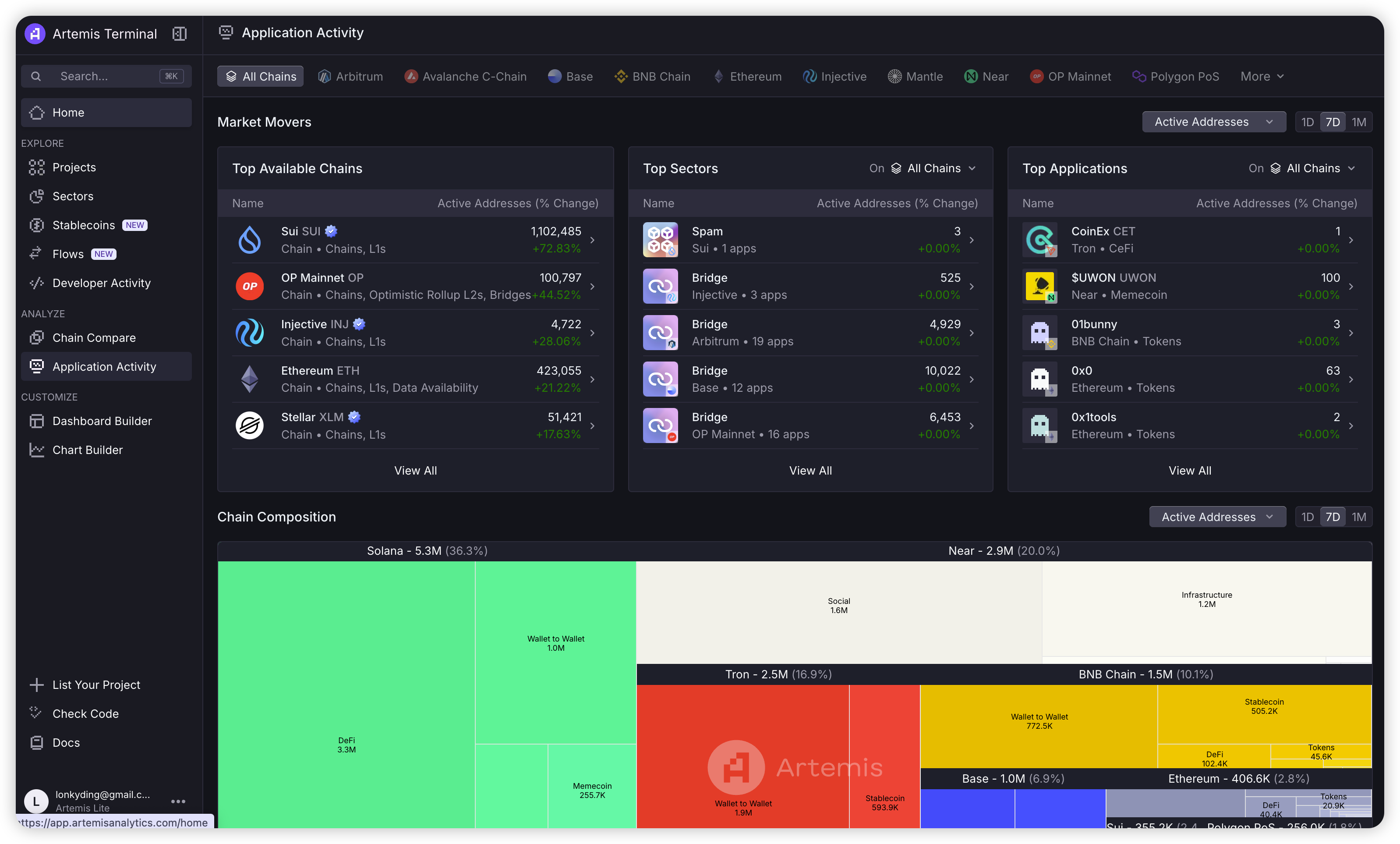 我用的比较多的是「analyze-application activities」,它按照链、赛道、应用三个维度展示榜单,同时也会展示链的活跃地址/tx/gas 的热力图,我一般只看应用维度的榜单。