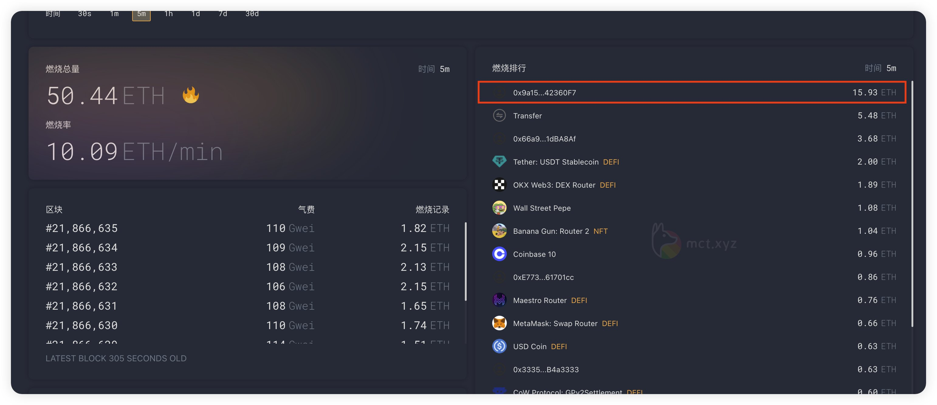 有的时候会看到一些新闻,说以太坊的 gas 突然爆表了。这时候可能是某个热门合约导致的,也可能是行情清算导致的。这时候可以通过 @mctxyz 查看高 gas 的消耗情况,然后去 oklink 查看这个合约情况,搜一下就知道谁是凶手。