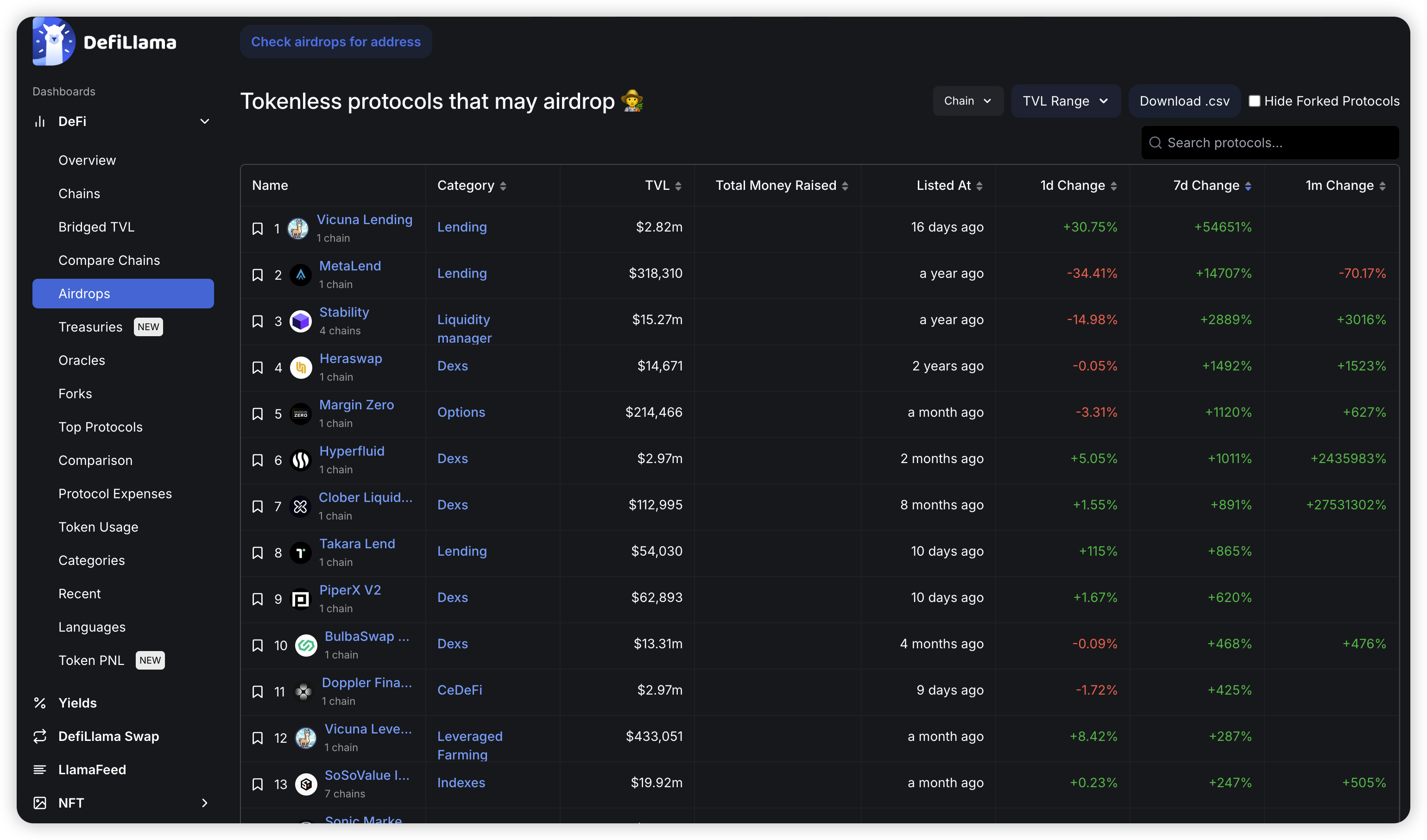@DefiLlama 有一个 aridrops 的看板,可以从中筛选tvl 增长比较快,还没有 tge 的项目。一般 tvl 增长的快的项目,都是最近有在搞事情的(项目方在做事)。一方面可以从资金角度目前都有哪些,一方面也可以研究下他们的活动,交互交互。不过这个更新速度没那么快,比如说 sosovalue 已经tge 了,但还在榜单上。