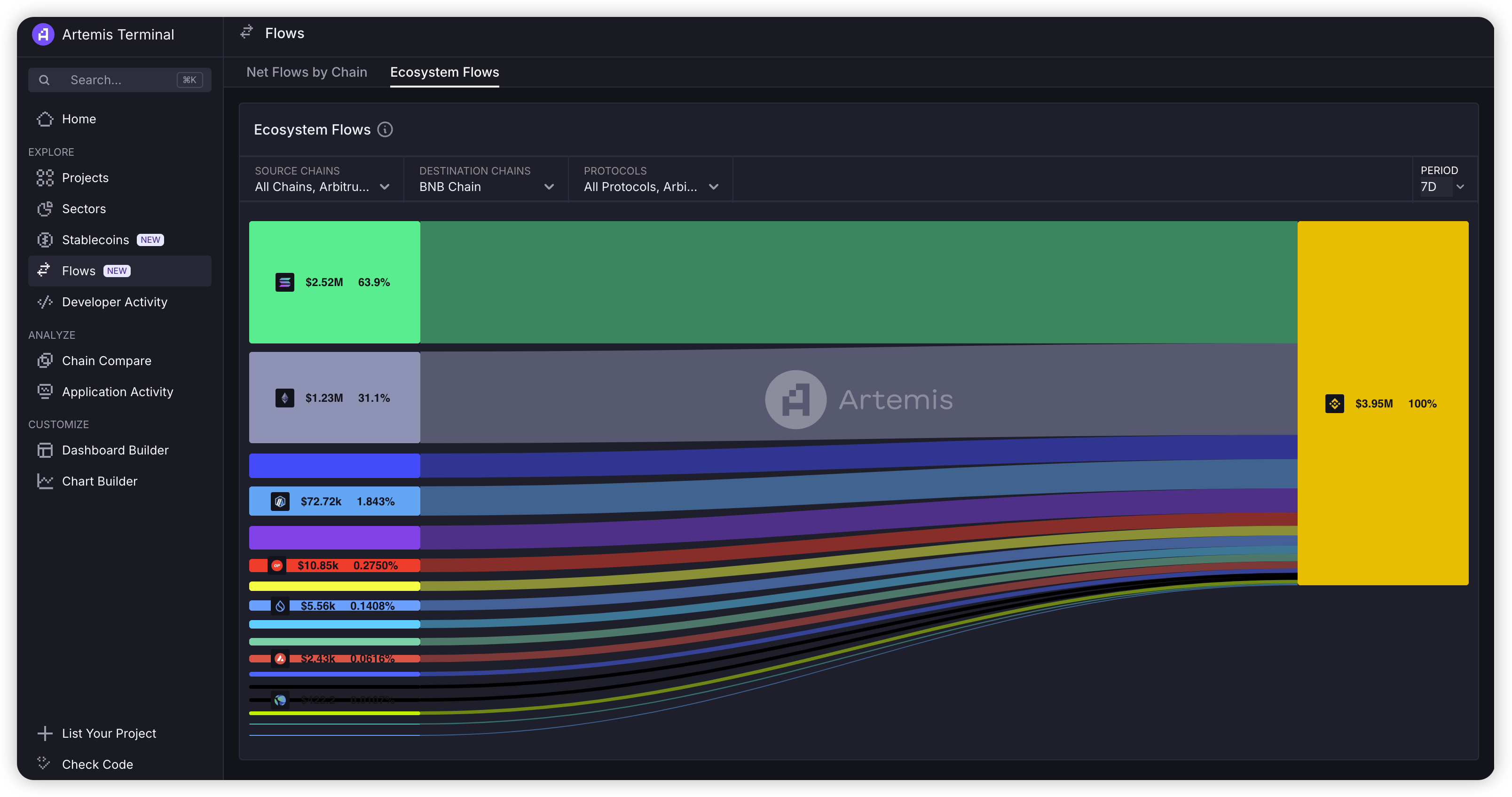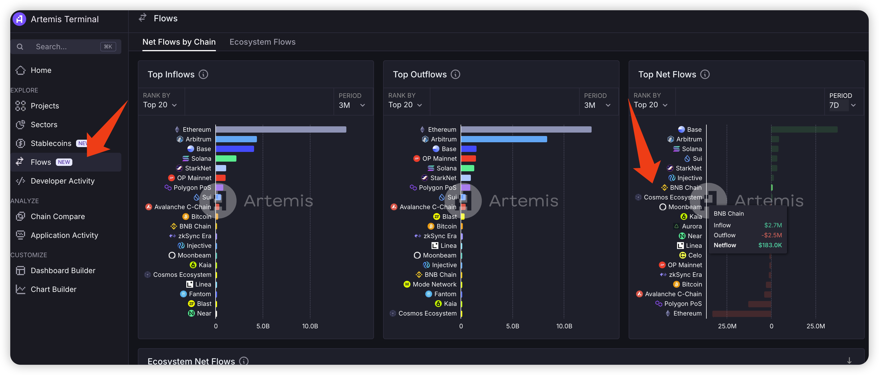用 @artemis 发现新热项目,artemis 是一个链上数据网站,有很多比较详细的公链、协议的数据,可以快速的看到宏观数据:例如不同赛道的协议数据变化、公链的流入流出、稳定币的情况、开发者的活跃情况等。