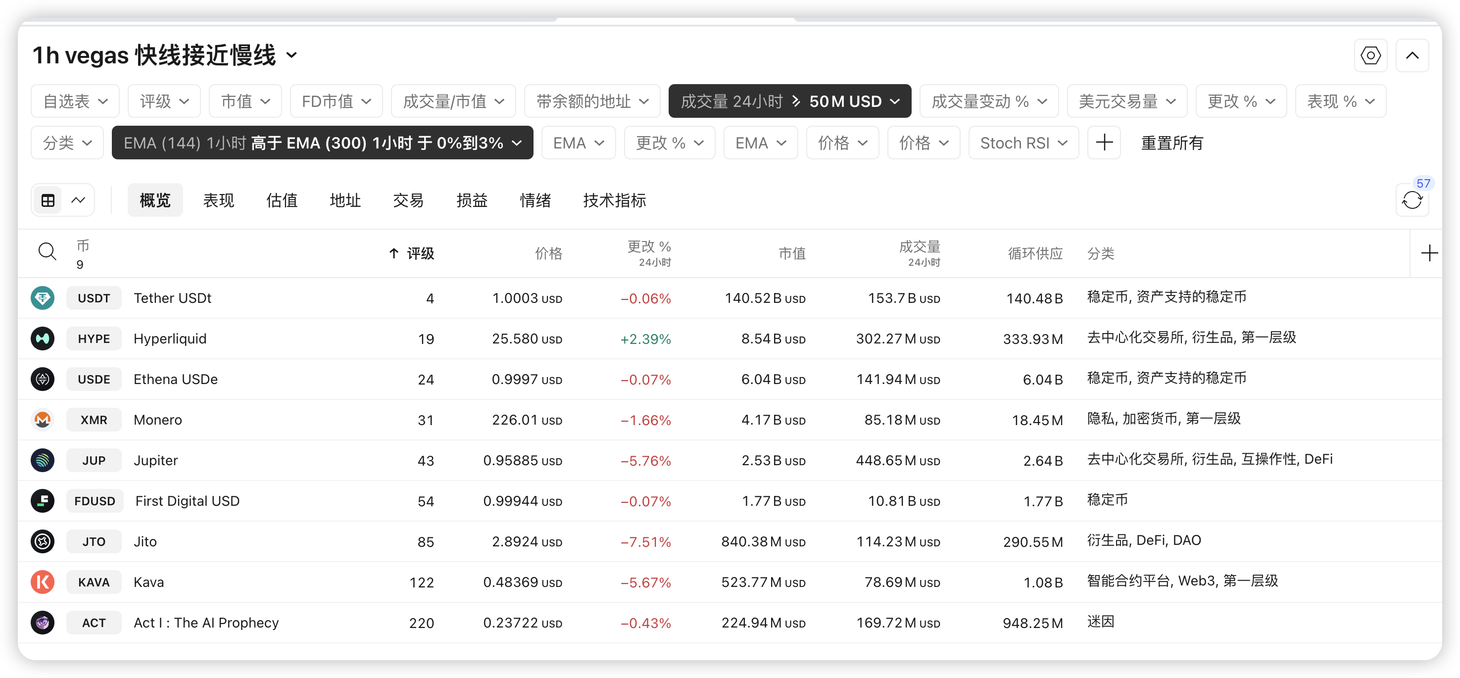 我用的 tradingview 的加密货币的筛选器,然后设置自己的筛选条件,他会每分钟自动更新。比如我就主要筛选 vegas 附近的情况,再看看具体情况是否值得买入。这样能省很多时间。