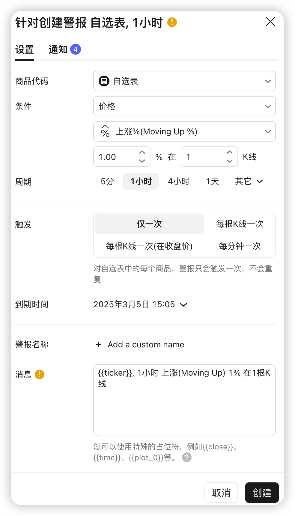 此外,tradingview 还支持自选提醒,满足某个指标之后就给提醒。适合有比较成熟的交易策略的人使用。