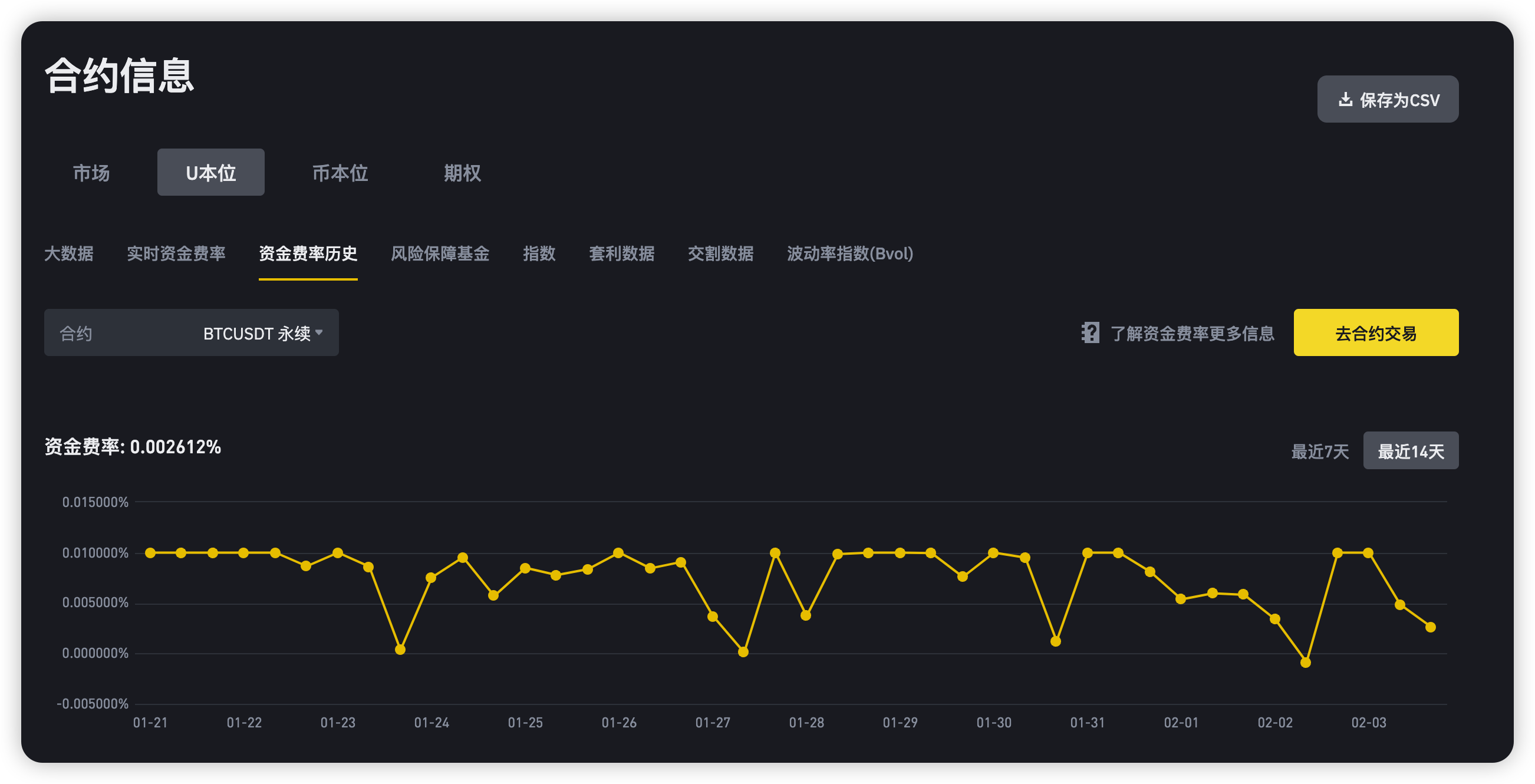 - 资金费率:资金费率是永续合约市场价格与现货价格之间价差的体现。简单来说,当合约价格高于现货价格时,资金费率通常为正,多头需要向空头支付费用;反之,当合约价格低于现货价格时,资金费率为负,空头需要向多头支付费用。通过查看资金费率的正负,可以判断市场情绪。如果资金费率持续为正且较高,说明市场看多情绪浓厚,但需警惕回调风险;若资金费率持续为负且较低,说明市场看空情绪较浓,可能有反弹机会。