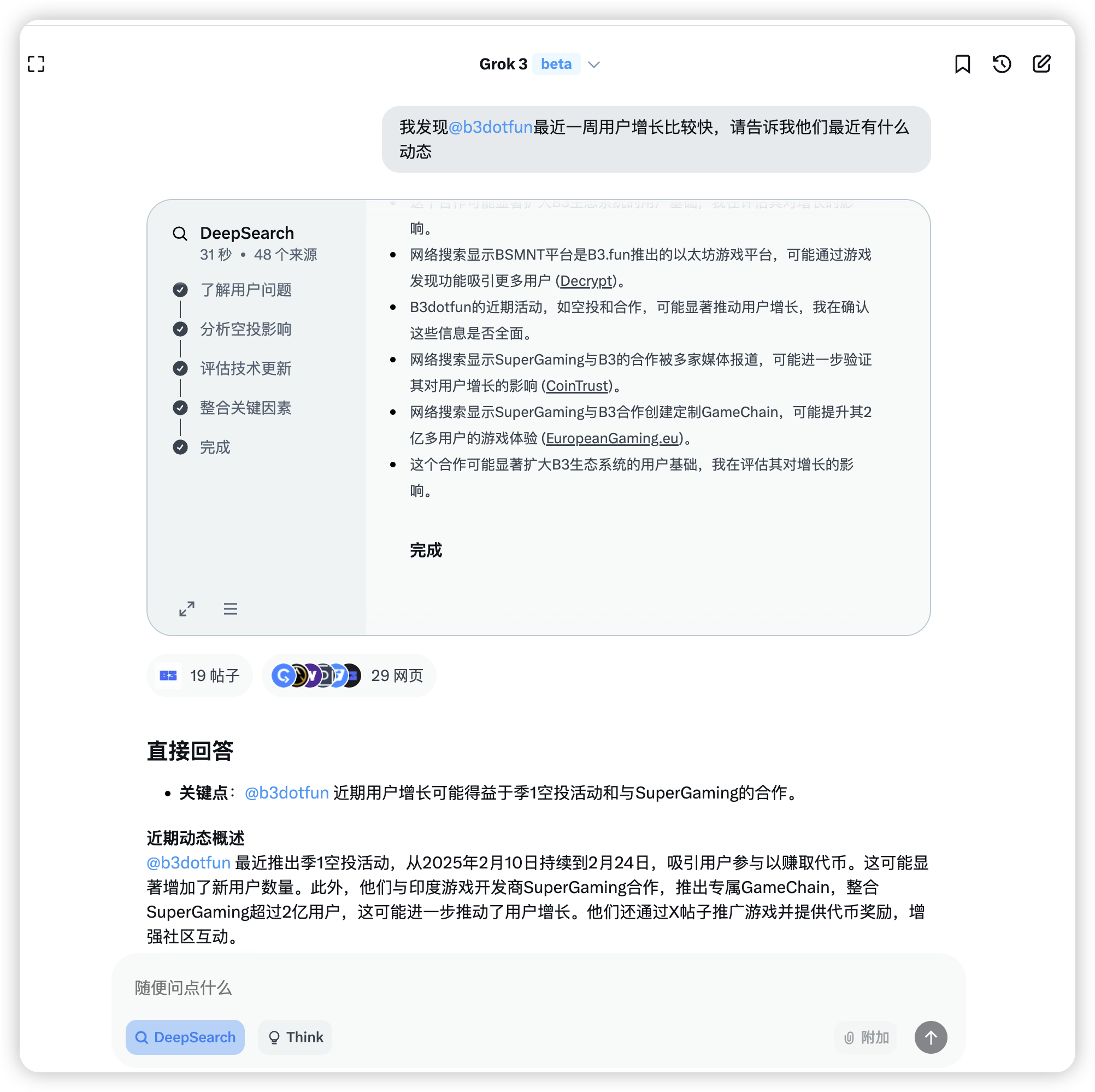 举个例子,通过数据发现了 B3 这个项目,是 base 上的 gamefi。然后去 rootdata 上了解下基本面。如果还想了解下,可以用 grok 快速了解下最近做了什么带来的用户增长,得到的结论是有个空投活动以及和 supergaming 合作了。