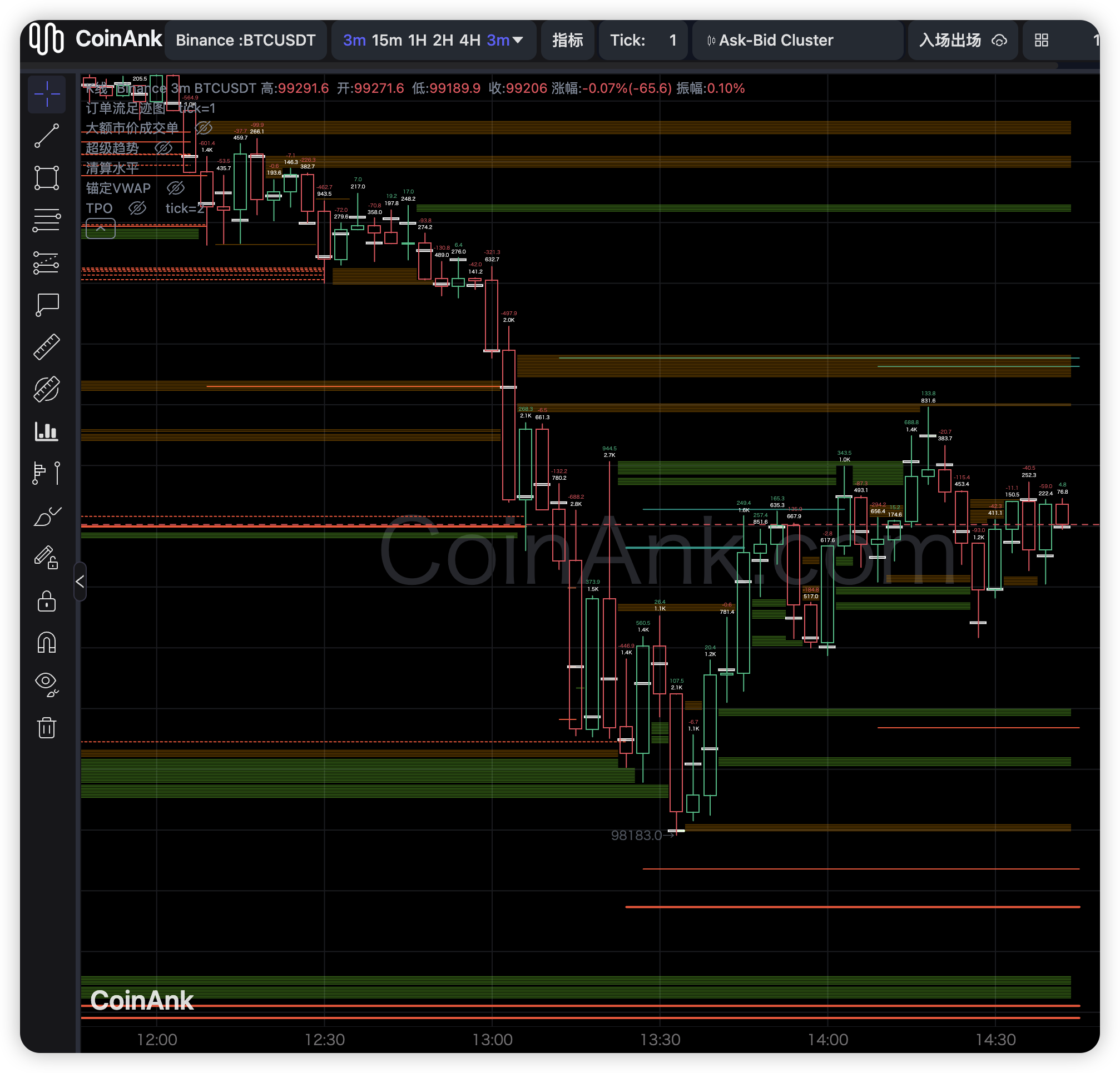 足迹图还有很多值得说的东西,比如说如何通过足迹图来寻找潜在的反转点、如何通过足迹图来判定真假突破等等,大家感兴趣的话后面再单独说足迹图。目前足迹图做的比较好的是 coinank,相比于 tradingview 他的精度更高,体验也更好。他有个入门教程非常详细 https://coinank.com/zh/articles