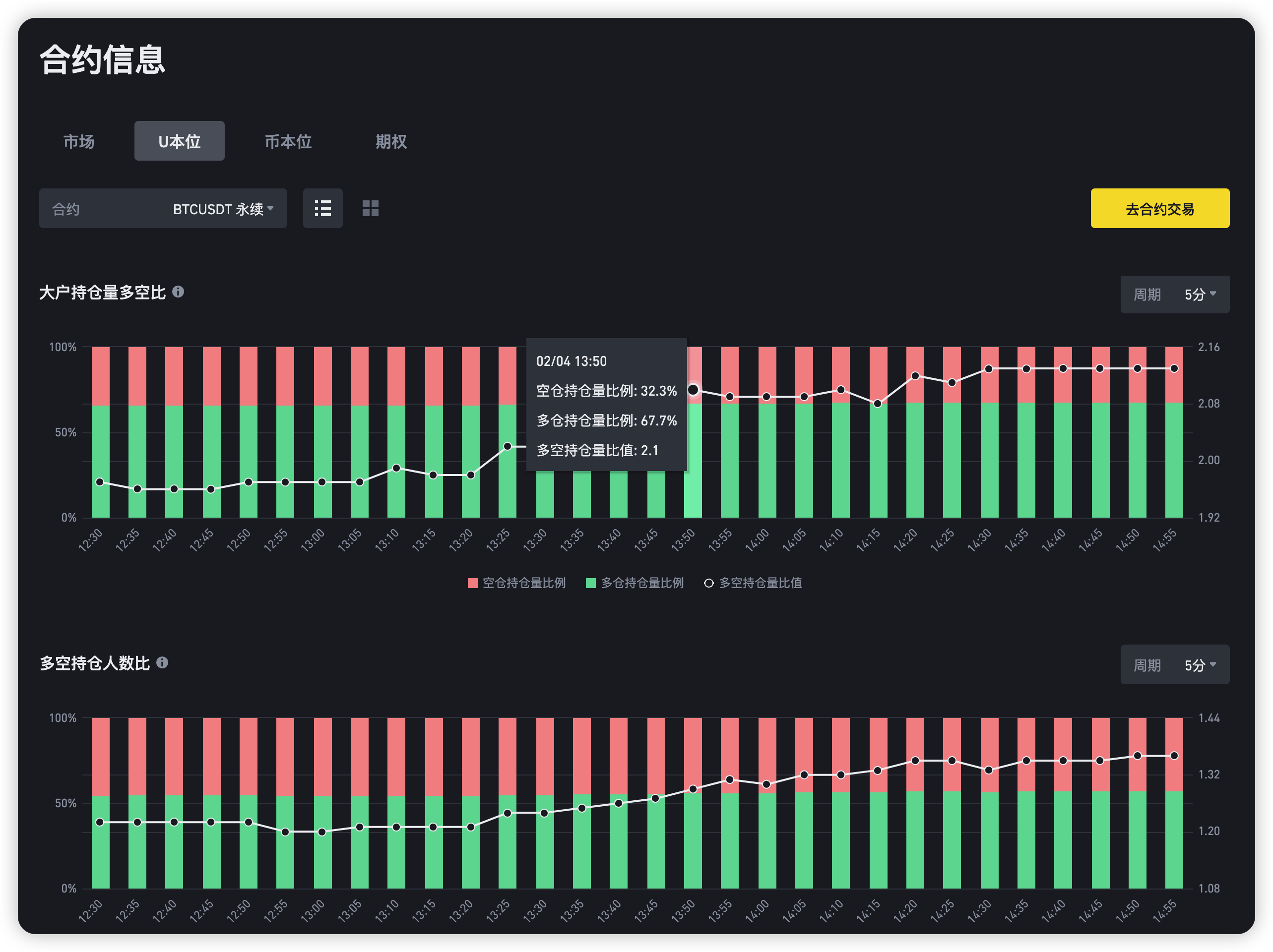 - 多空比是衡量市场多空力量对比的指标。它通常通过计算市场中多头持仓量与空头持仓量的比例来得出。一般可以看多空人数