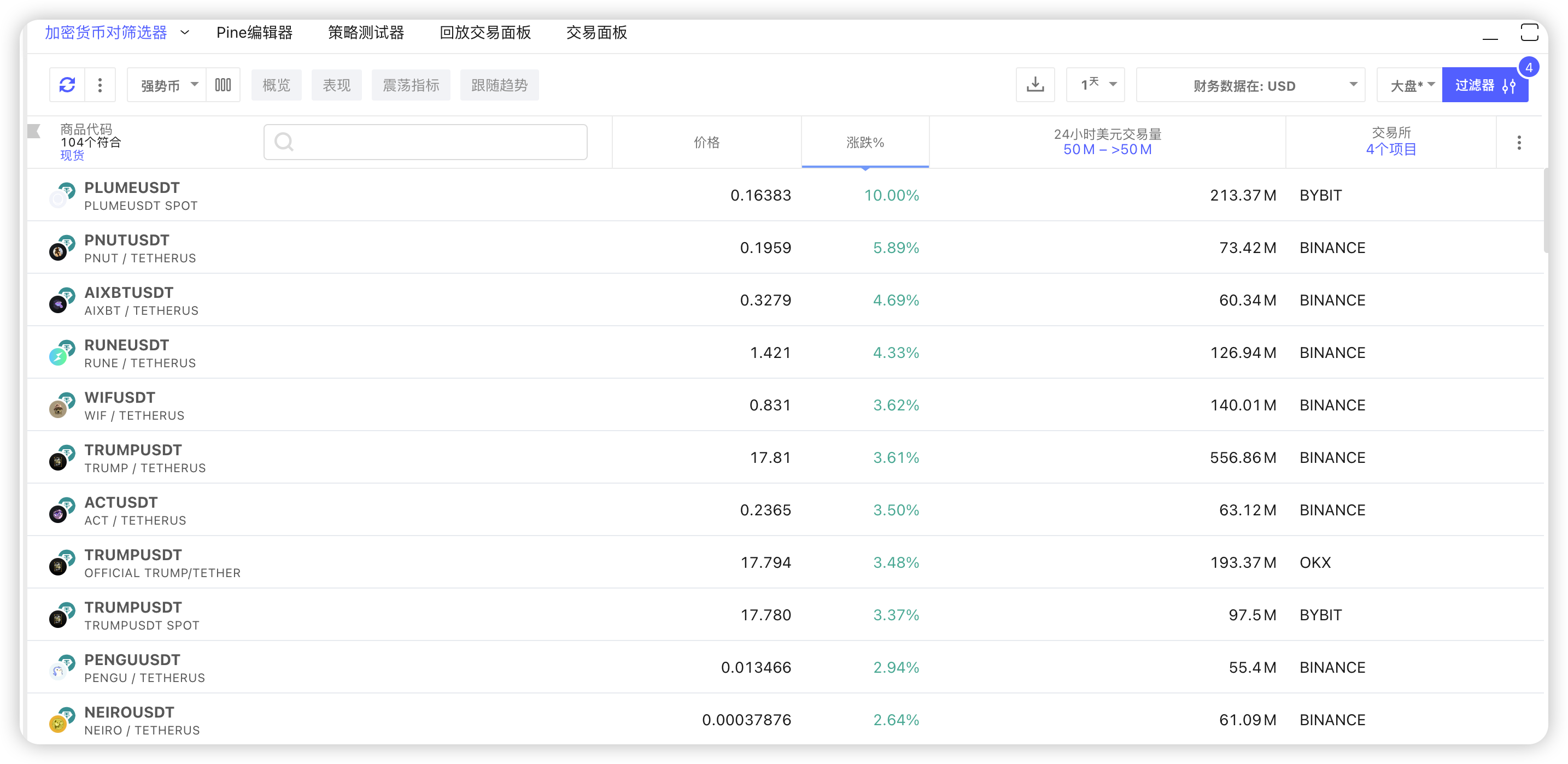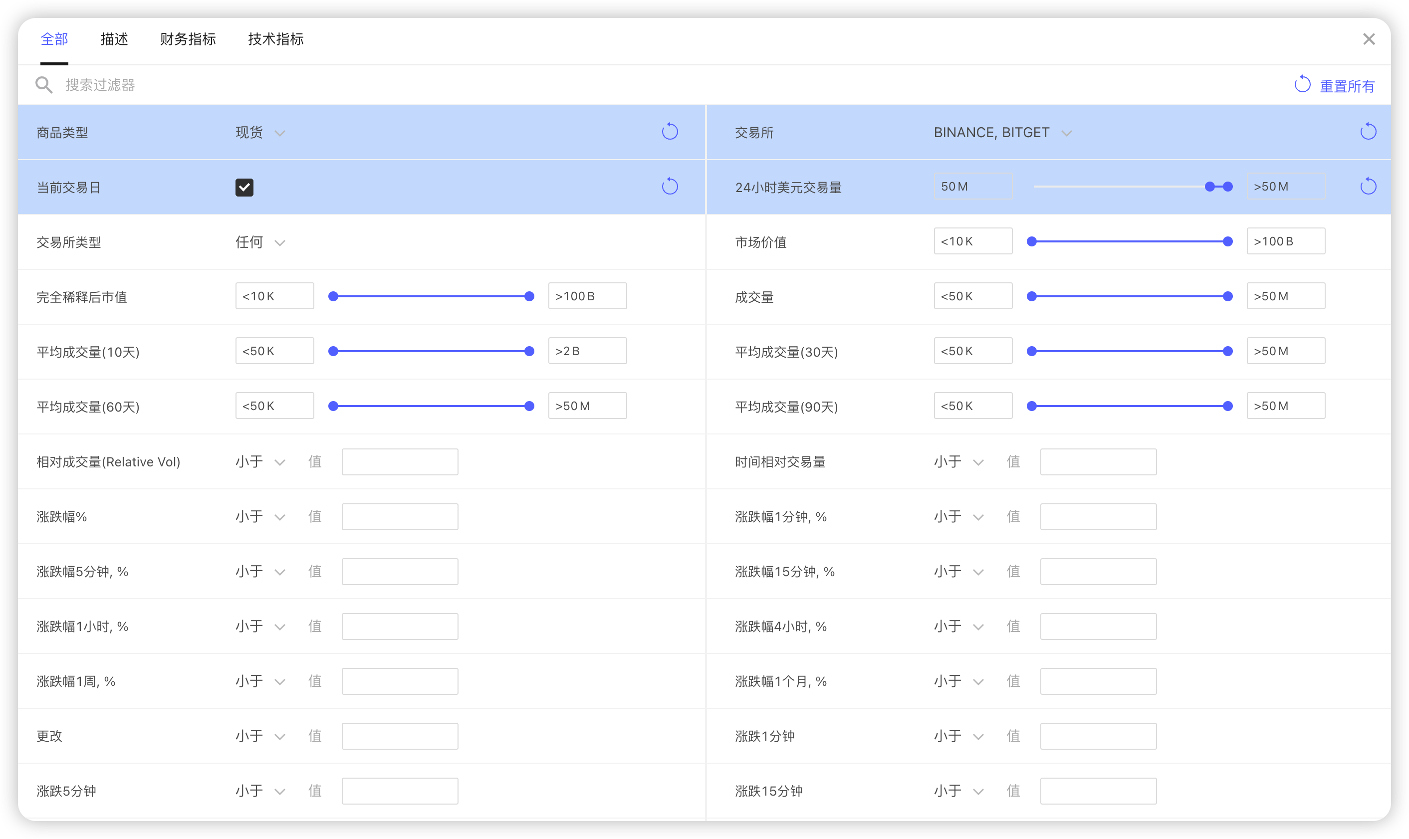 支持多种个筛选,我一般是选择 4 大交易所,然后加一个成交量的过滤条件,减少一些低市值的噪音。